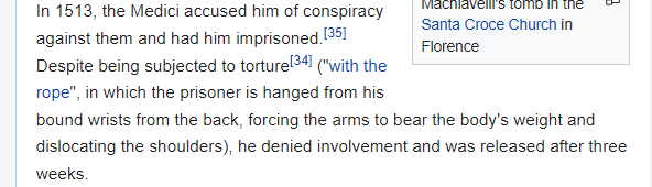 That Machiavelli is best known for his sycophantic book gifted to an aspiring tyrant, complete with a plea to look after his own hide and please not torture him more, instead of the collection of his own pro-republicanism, pro-liberty beliefs dedicated to the friends who forced him to write it, friends who do not even merit their own wikipedia pages, is the ultimate ironic tragedy.