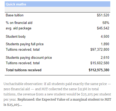 If MIT had to charge all undergraduates the same tuition, they would collect the exact same revenue by charging $25,105/year — 48% of actual tuitions.