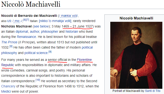 Our protagonist — Machiavelli — was born 35 years after the Medici family had began to grasp power. He lived through the death throes of the Republic and actively conspired to restore it. When the Medici “reconquered the republic in 1512”, per the underlined section above, they sent him into exile and ended his political career.