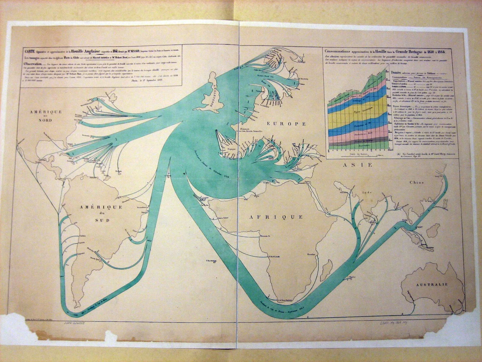 British Coal Exports in the year 1864, 1mm thickness on the blue bars is equal to 20,000 tons — note that the bulk of British Coal was actually consumed in domestic production — this was just the leftovers