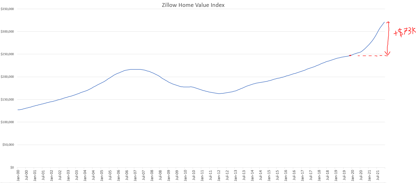 Note the x-axis on home value here is not linked to the previous 3 charts — Zillow only provides data since 2000, and the current data is through December ’21. Average home value increases over the last 2 years were equal to Home Value increases in the 6 year period between May ‘13 → Dec ‘19 source