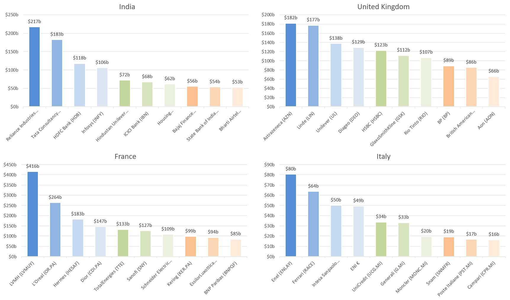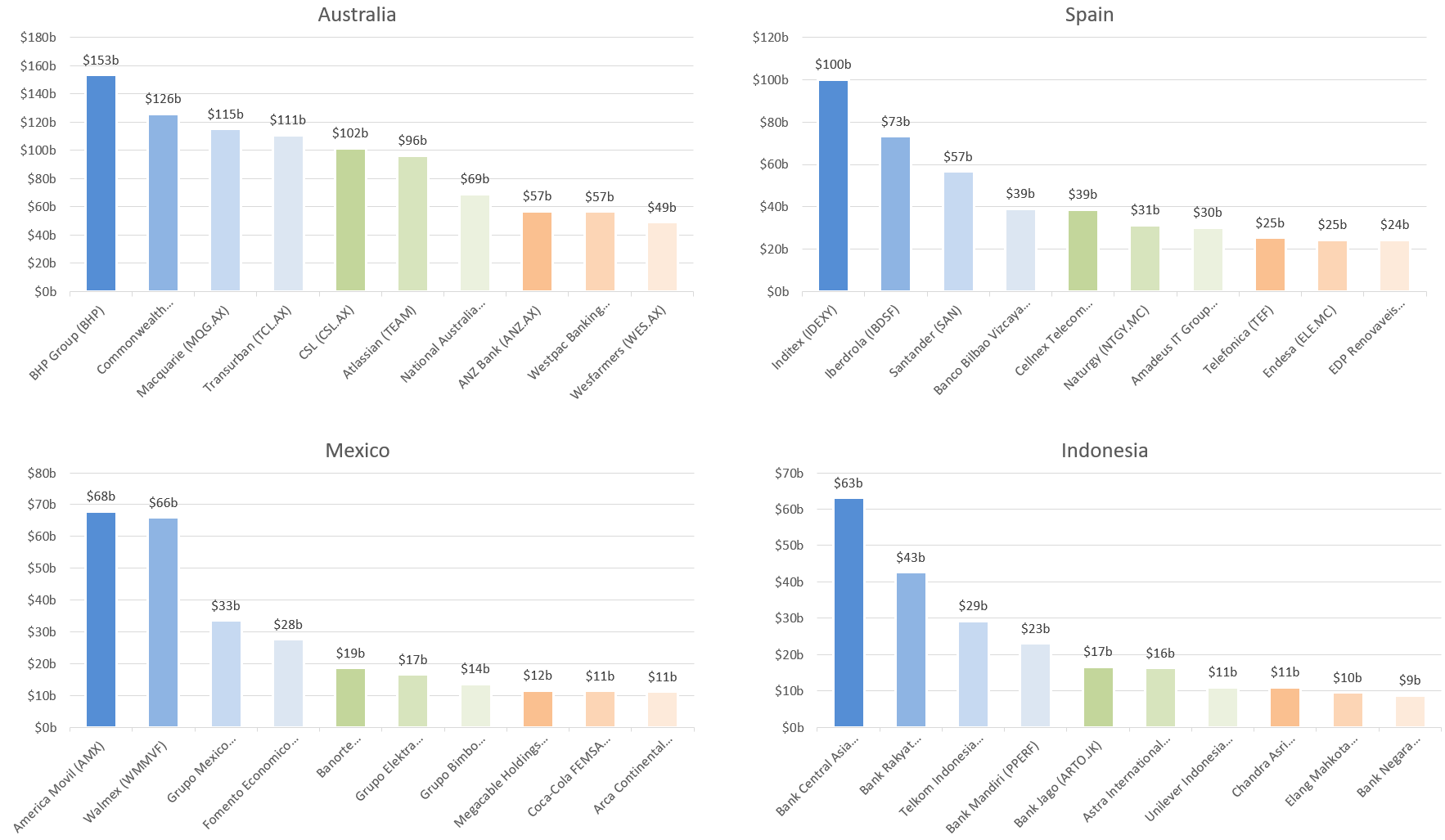 • Within all these nations, the best companies are worth multiple times more than the rest