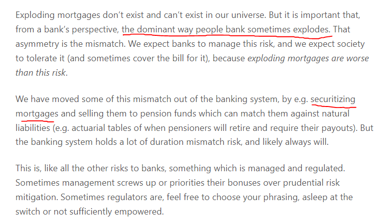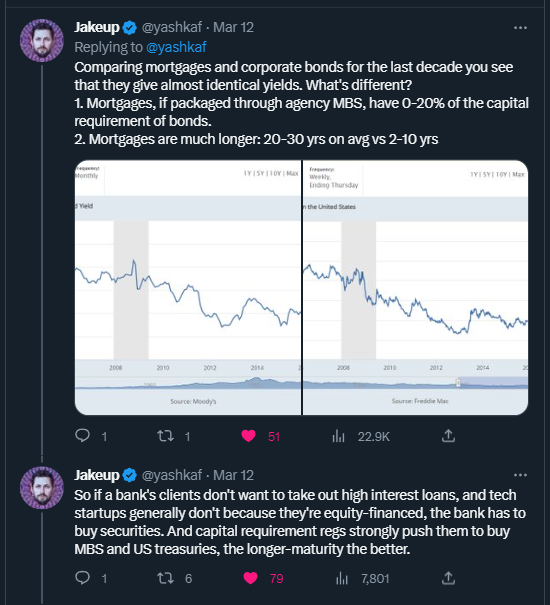 Media commentators have & will continue to fixate on VCs because they’re a functional outgroup for an increasingly tech-hostile press (“wealthy cabal of elite financiers” is an easy slam dunk and always has been). They will not focus on the December 2022 Seeking Alpha blogpost suggesting SVB was insolvent or Byrne Hobart’s (expensive!) February newsletter post outlining the same. They will not focus on SVB’s poor decision-making — both its questionable macro decision-making (why buy $80B of Mortgage Backed Securities? why wait until rates wen to 4.5% to try and address the problems?) and its micro decision-making within the crisis (you can lambast the Tech scene for many things, but these people expect clear & decisive executive communication and assume its absence is evidence of incompetence — in this case, that assumption seems prudent).