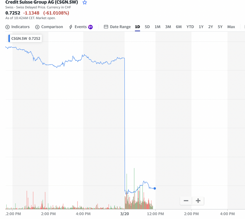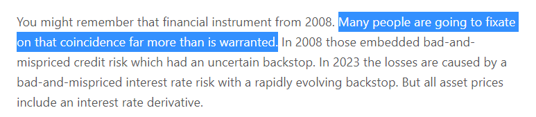 But if you had to assign probabilities there…is it 100% likely that the bank makes it? I doubt it (update: Credit Suisse just had to deal with $10b in customer withdrawals per day for a week before its fire sale— hardly a compelling alternative).