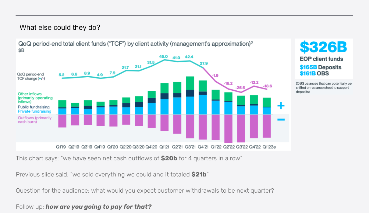 If there’s an alternate way to read slide 16 in their “strategic” announcement deck, I’d love to hear it. I imagine SVB would have been ok in Q2, but the question the deck leaves me with is “how many quarters of negative $20b in client funds can your bank sustain?”