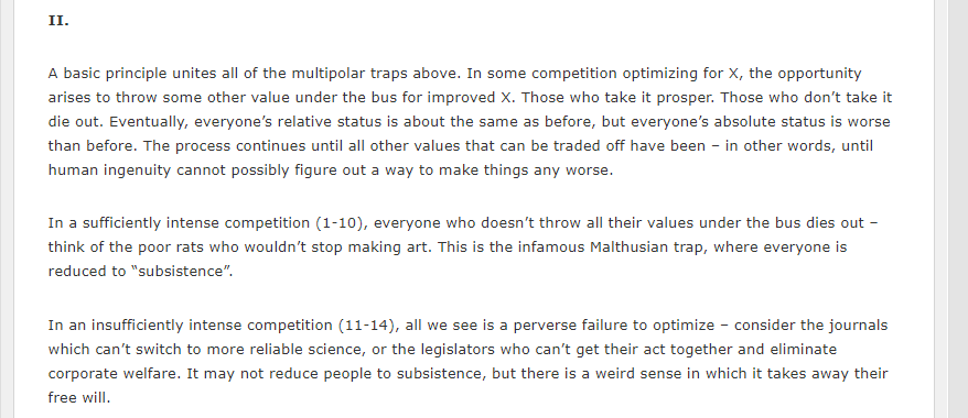 In my mind, this is directly tied to my essay on existential competition Moloch, linked above: