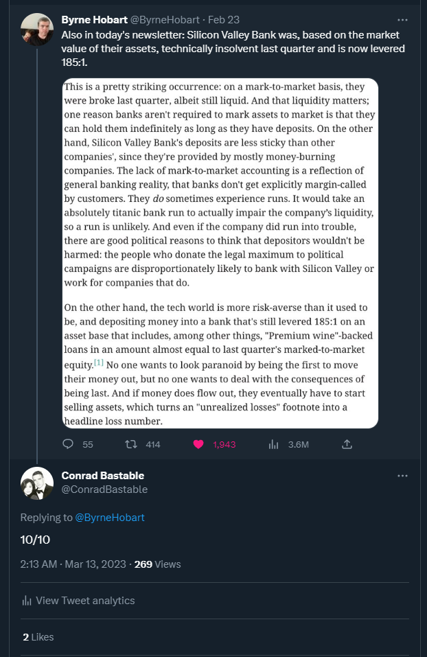As time moves on, our understanding of the SVB saga will improve. More sophisticated writers will take the time to understand what happened and then share their thoughts with the rest of us. The amount of conviction expressed on Twitter will unfortunately remain constant, but the complexity of the arguments will increase somewhat over time as the battle-lines are drawn and the professionals have time to build their arguments up.