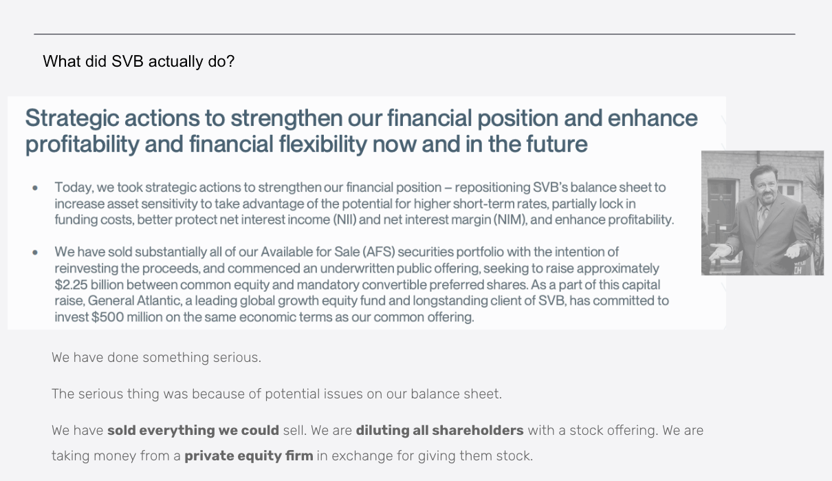 On Wednesday night, one of the guys on the team sent a tweet to our channel noting that SVB’s stock was down 30% after hours and linking to their “Strategic Actions” deck: