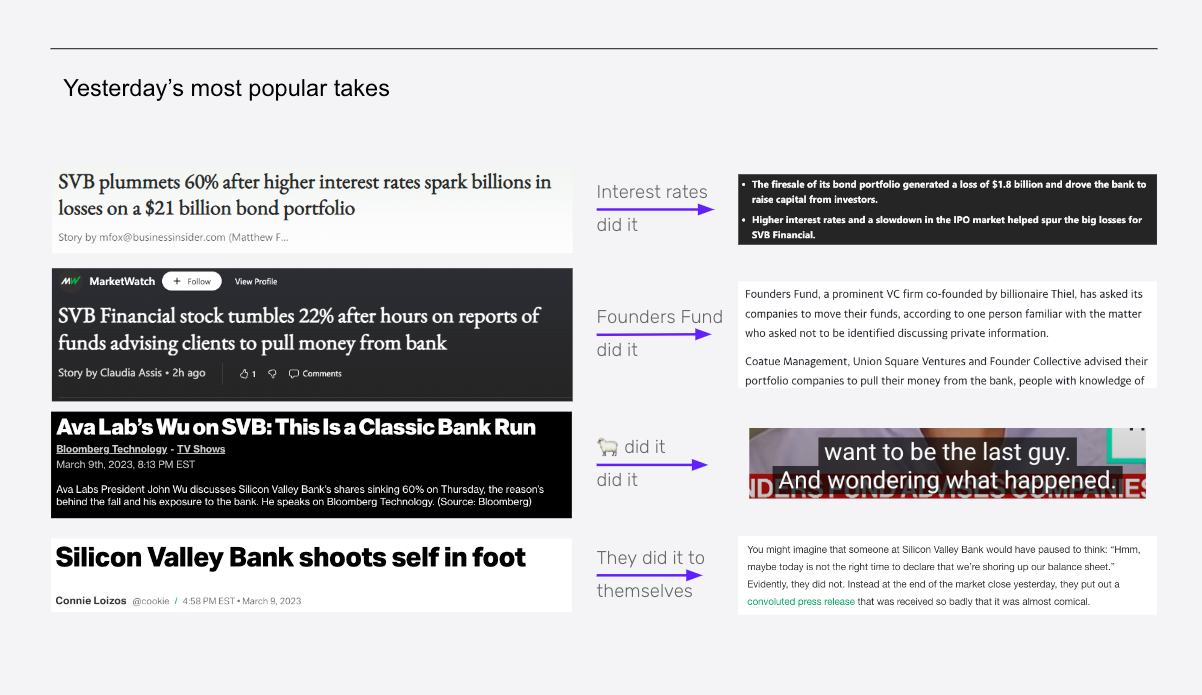I’m sure my own late-night post-hoc “sense making” attempts are also flawed, and certainly a single slide and 2.5 paragraphs doesn’t do justice to the multi-causal shitshow that happened last week. But I share this attempt at understanding because it’s more interesting to consider the analysis we had within the crisis than the stuff we can come up with now, weeks later. I don’t claim the above explanation is authoritative — it’s just my own best attempt at understanding a bank run a few hours after participating in it.