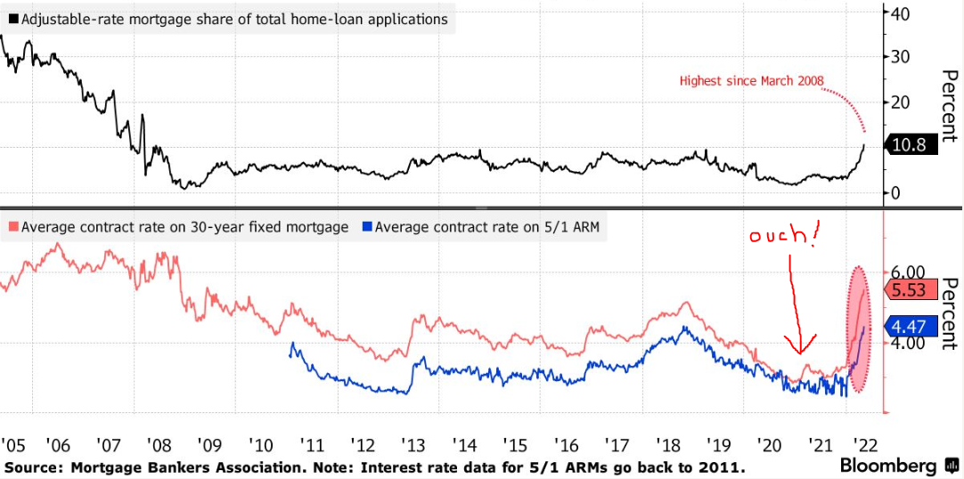 Look at the blue line: up until 2008, 20-50% of all mortgages were Adjustable Rate!