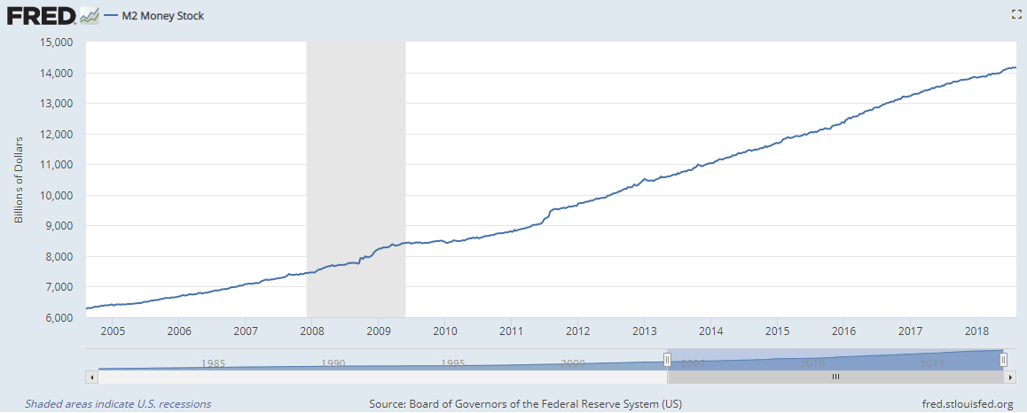 Which is pretty good news for the people at the Fed, and they should feel good about managing the money supply, which has increased pretty smoothly over the same time period.